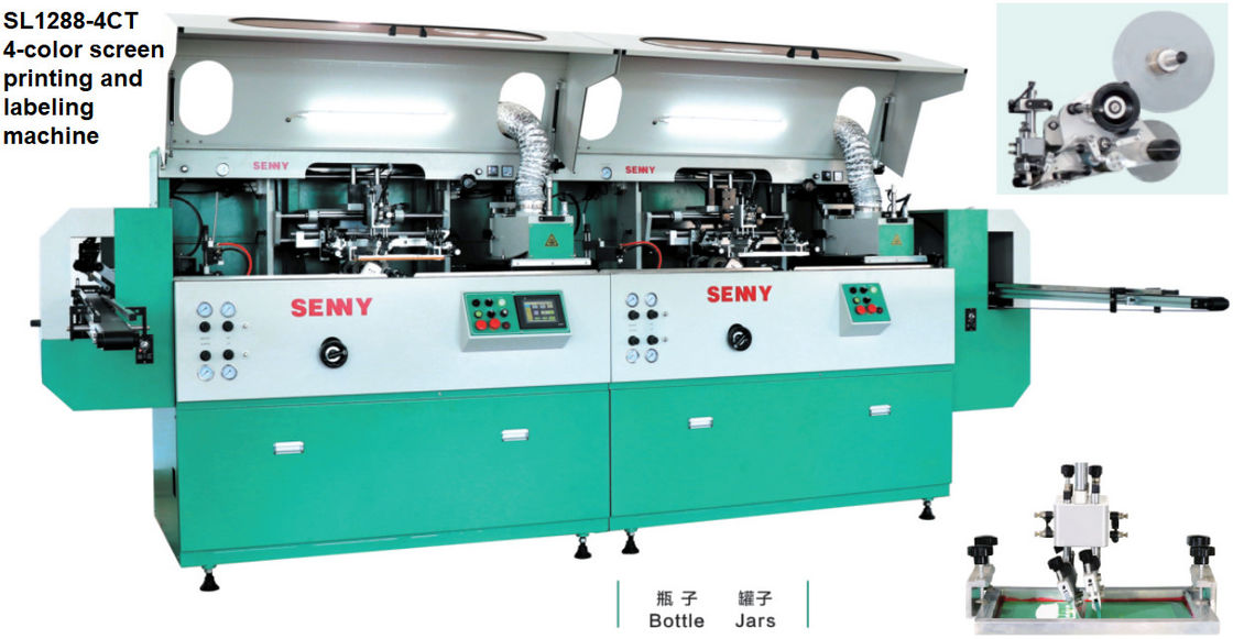 Diese Maschine S1288-4CT hat zwei Funktionen: Siebdruck und Kennzeichnung. Sie ist in der Nahrung, in der Medizin, im Schädlingsbekämpfungsmittel, in der Chemikalie und in anderen Industrien weitverbreitet. Die Behälter können zylinderförmige, elliptische oder quadratische Form sein.